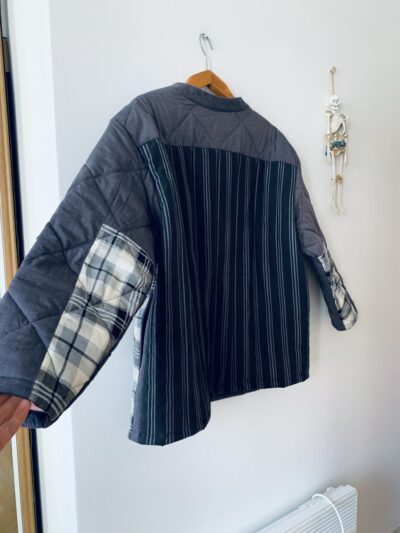 стьобана сорочка або куфайка. верхні матеріали – апсайкл бавовна, підкладка – шерстин. у догляді все просто, можна прати в машинці на делікатному режимі. є бокові кишені. лососевий колір всередині у поєднанні з сірим верхом – просто кайф! виконана бездоганно. супер затишна річ, м’яка, легка та тепла
