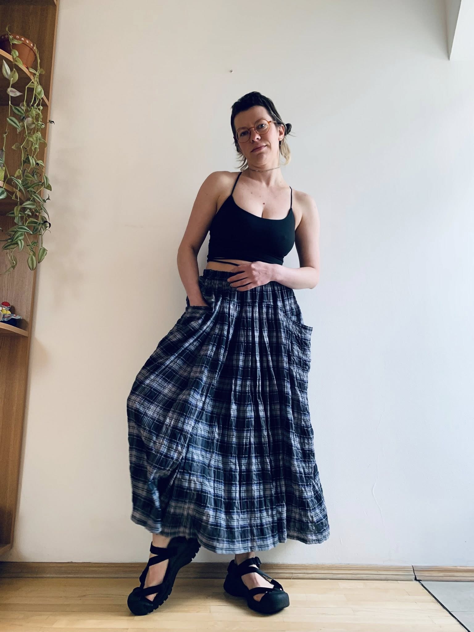 спідниця обʼємна, має великі кишені по боках, куди дуже приємно засовувати руки. підійде на талію від 75 до 90 (а може й 95) см, довжина – 93 см