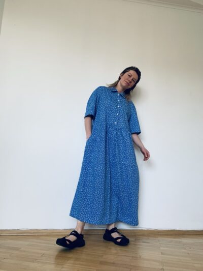 сукня з ретро-тканини, яка перейшла до нас від полтавської бабусі нашої подруги. ідеальної якості та стану бавовна, помірний оверсайз, бічні кишені